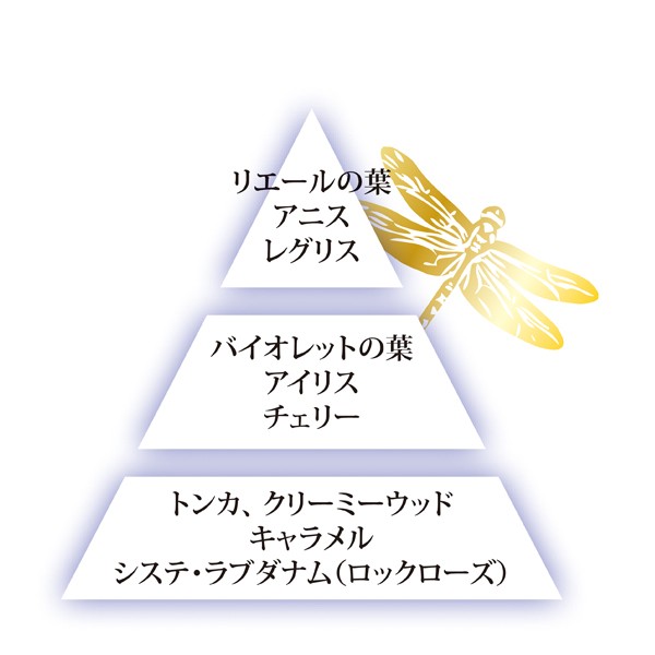 トップノートは、まずスターアニスのフレッシュな香りとアイビーリーフのほのかな酸味から始まり、しかし、あっという間にオリエンタルでセンシュアルなリコリスのブーケの香りとグルマン系な香りに移行。 ミドルノートでは、フローラルノートで贅沢な余韻を長く持続させます。バイオレットリーフがエレガントさを、アイリスが繊細さを添えます。 トンカビーン、クリーミーなウッド、シスタス、キャラメルのベースノートが全体にさらなる贅沢さと官能性をもたらします。